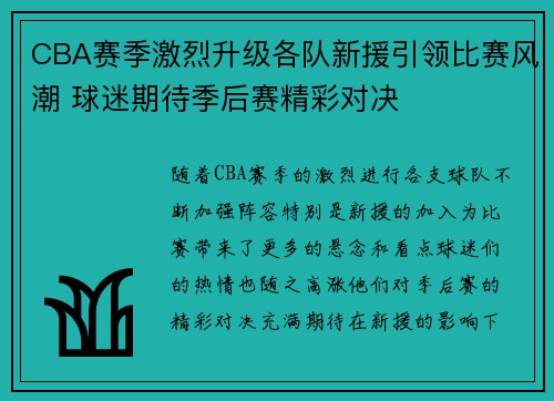 CBA赛季激烈升级各队新援引领比赛风潮 球迷期待季后赛精彩对决