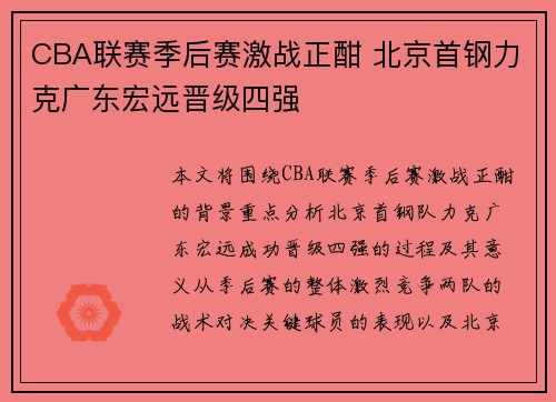 本文将围绕CBA联赛季后赛激战正酣的背景,重点分析北京首钢队力克广东宏远成功晋级四强的过程及其意义。从季后赛的整体激烈竞争、两队的战术对决、关键球员的表现、以及北京首钢的晋级意义等方面入手,详细解读这场比赛及其对CBA联赛的影响。通过对比赛战况、球员数据、教练战略及球队表现的全方位剖析,本文将全面呈现一场精彩的季后赛对决,并最终总结其背后的深层次意义。
