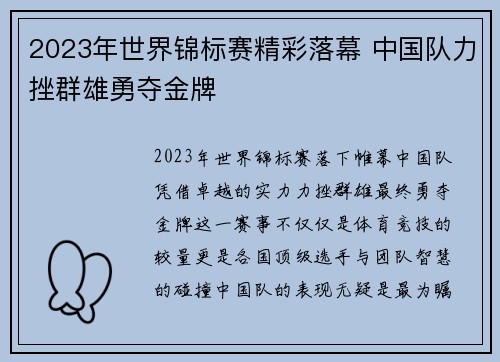 2023年世界锦标赛精彩落幕 中国队力挫群雄勇夺金牌
